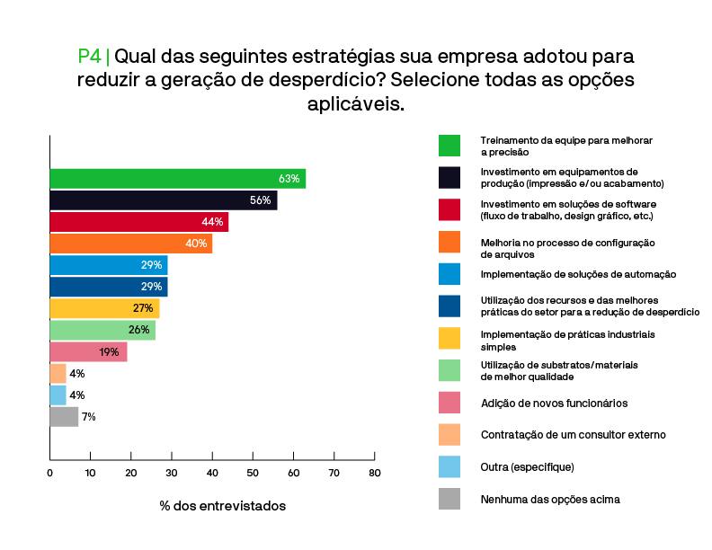 Apenas um quarto dos entrevistados concordou plenamente que as suas empresas implementam e seguem estratégias de redução de desperdício. Essa é uma estatística preocupante no que diz respeito à necessidade dos prestadores de serviços de impressão de maximizar a sua eficiência de produção e os custos associados, bem como ao desejo de reduzir seu impacto ambiental ou sua pegada de carbono. Portanto, quando questionados sobre as estratégias que adotaram para melhorar a redução de desperdício, os entrevistados indicaram que tentaram diversas abordagens.