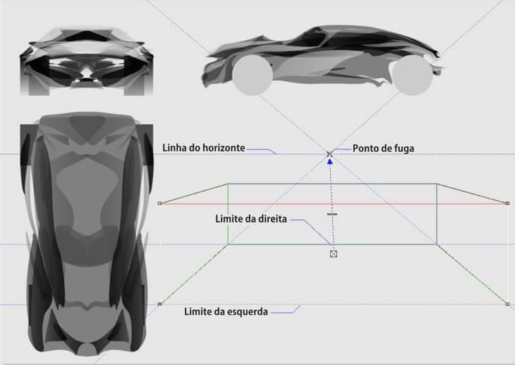 Como usar a ferramenta Perspectiva, deformação em perspectiva e as linhas-guia para criar um carro esportivo com um único ponto de fuga