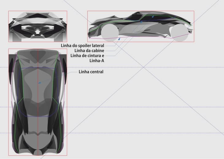 No Design Automotivo, há alguns termos usados em todo desenho, que indicam características que todos os carros têm em comum, independentemente do tipo e forma. Em nosso desenho, nós vamos indicar três linhas principais, cujas Vistas superior e lateral têm em comum. Isso nos ajudará a projetar pontos em perspectiva.