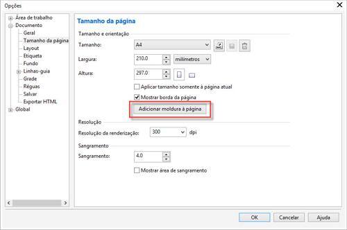 - Abra um novo arquivo (Arquivo > Novo... ou CTRL+N), vá para Layout > Configurar página e clique em "Adicionar moldura à página" (uma moldura de página também pode ser adicionada clicando-se duas vezes na ferramenta Retângulo da caixa de ferramentas).