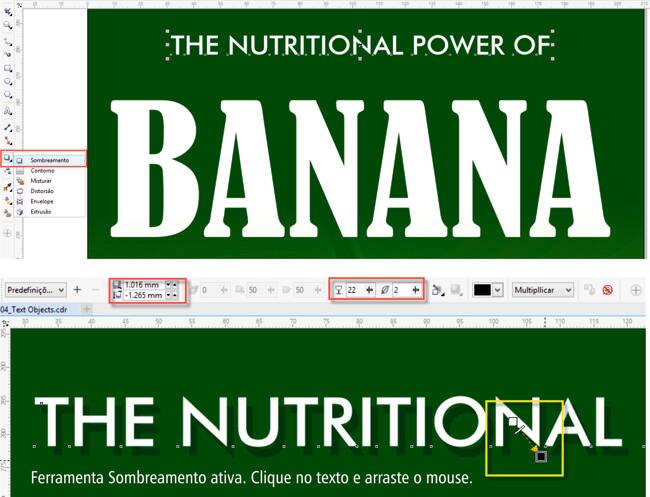 - Selecione o texto "The Nutritional Power..." e clique na ferramenta Sombreamento (Caixa de ferramentas > Sombreamento). Arraste o mouse a partir do texto para criar a sombra e ajuste os parâmetros da sombra na barra de propriedades.