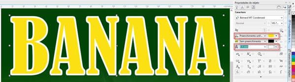 - Selecione o próximo objeto de texto (Banana) e, usando as Propriedades de texto na janela de encaixe Propriedades do objeto, preencha-o com uma cor amarela e aplique um contorno branco (espessura: 1,5 mm).