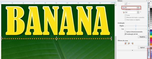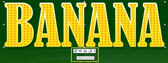 - Selecione o conjunto de círculos e vá para Objeto > PowerClip > Colocar dentro do recipiente. O cursor do mouse se transformará em uma seta. Clique no texto "Banana" para inserir os círculos. Para terminar, na barra de ferramentas PowerClip, clique no ícone Editar PowerClip.