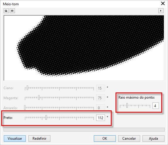 - Vá para: Bitmap > Transformação de cor > Meio-tom. Ajuste os parâmetros de ponto máximo e preto. (Aqui, defini as configurações de ponto máximo como 4 e de preto como 112.)