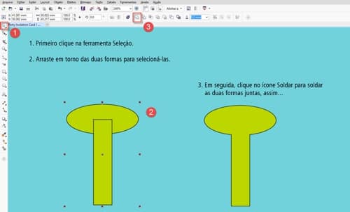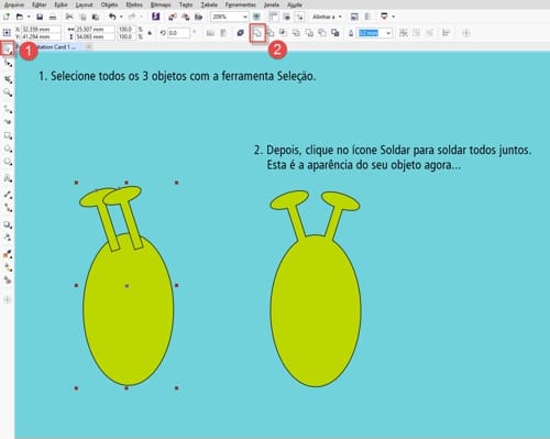 - Com a ferramenta Seleção, na parte superior da caixa de ferramentas, arraste as duas novas formas e clique no ícone Soldar para soldar as duas juntas.