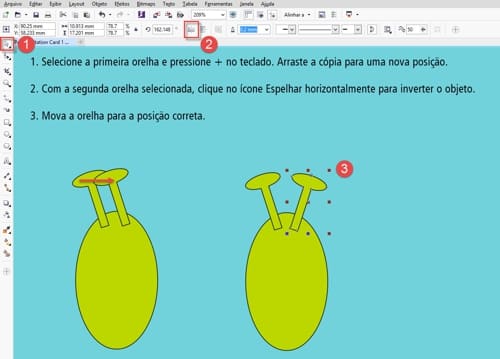 - Arraste a cópia para o lugar e use o ícone Espelhar horizontalmente da barra de propriedades para inverter o objeto. Mova a segunda orelha para a posição correta.