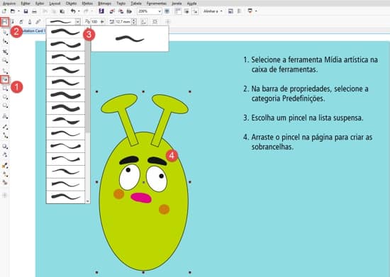 A ferramenta Mídia artística permite desenhar formas vetoriais que parecem quase como se fossem pintadas com um pincel. Existem muitas mídias artísticas à sua escolha! Agora, vamos usar a ferramenta Mídia artística para criar as sobrancelhas do Monstro verde.