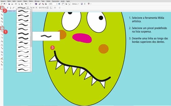 - Para terminar a boca, selecione a ferramenta Mídia artística (I) novamente na caixa de ferramentas, escolha um pincel na lista de Predefinições na barra de propriedades e desenhe uma linha ao longo das bordas superiores dos dentes.