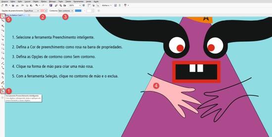 - Agora, selecione a ferramenta Preenchimento inteligente na caixa de ferramentas e, na barra de propriedades, defina as Opções de preenchimento como uma cor rosa. Defina as Opções de contorno como Sem contorno.