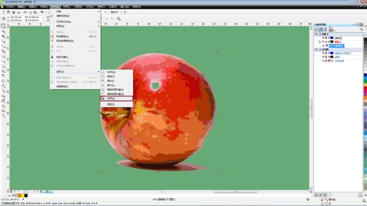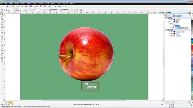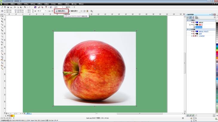 我们来了解其中三种工具:使用命令文件 > 导入,在 CorelDRAW 中导入苹果图像,并使用鼠标右键选择“编辑位图...”。这将使用 Corel PHOTO-PAINT 打开图像。