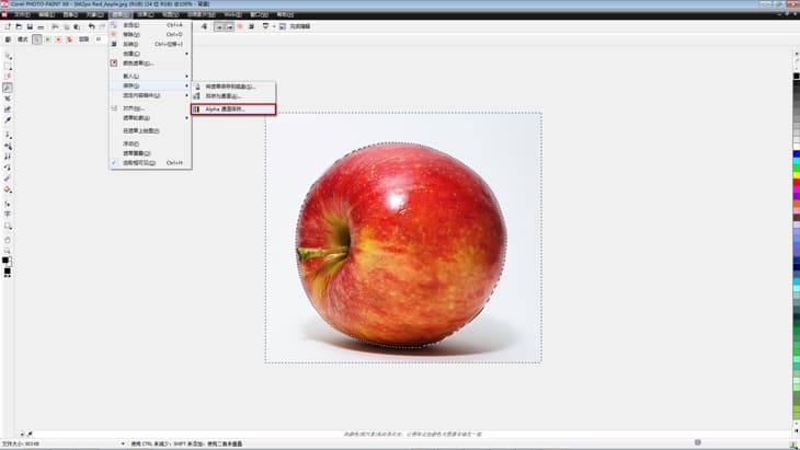 如何在 Photoshop 中移除背景图像以便将其放入 CorelDRAW 中?当然,这有很多种方式。例如,可选择该苹果,然后将此选择另存为通道(选择 > 另存选择为...> 选择新通道)。完成!