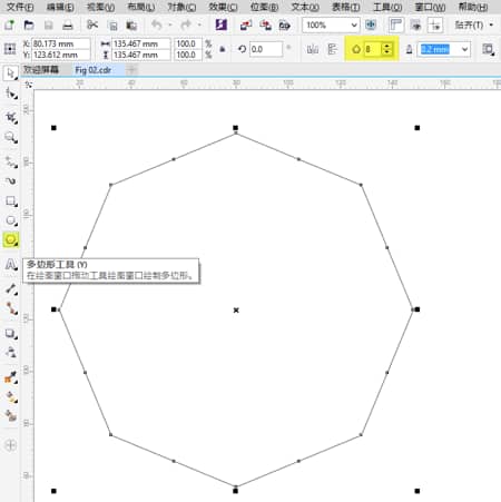 绘制完多边形后,使用挑选工具将其选中。您可以随时更改多边形的边数,只需在属性栏的点或边框中键入数值。请记住,如果您希望更改某个对象,则必须使用挑选工具选中该对象。
