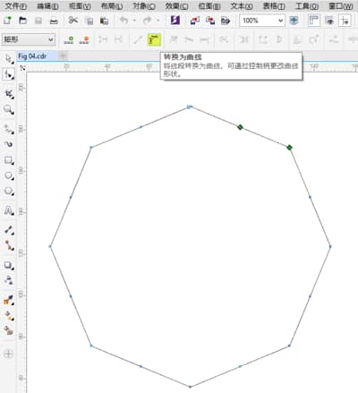 多边形的两个节点将高亮显示,且属性栏中将显示用于编辑节点的选项。单击转换为曲线图标。