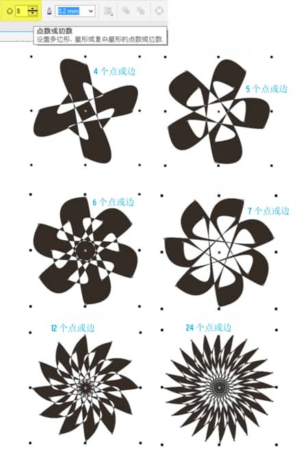乍看之下,您不会注意到有太大的变化。但是,在使用形状工具单击了多边形的某个节点或路径,并向内或向外拖动光标后,您会发现多边形的边变得弯曲。这使您可以创建各种形状。看一下: