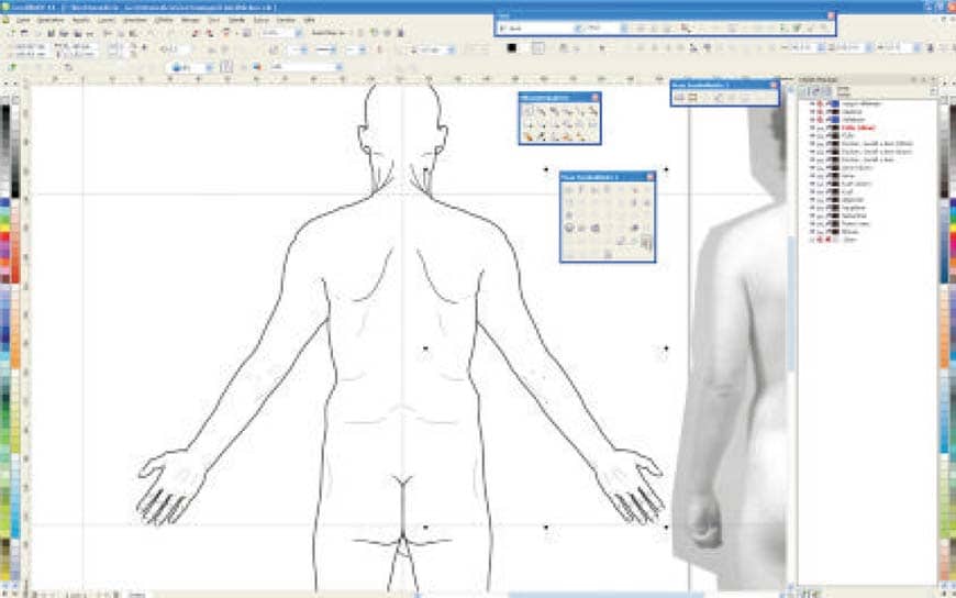 Systematisch ging Hans-Jürgen Stoffels vor. Zu allererst musste das gesamte Material zusammengetragen werden: Aktfotos, Organfotos aus der Anatomie, Zeichnungen, Modelle. Hier war alles zulässig: Als eine Fundgrube erwies sich zum Beispiel das Internet. Von dort wurde die Zeichnung eines Skeletts heruntergeladen und diente als Vorlage. Natürlich musste das Material vereinheitlicht und angepasst werden. „Zum Beispiel, wenn auf einem Foto die Frau nicht dieselbe Stellung einnahm wie der Mann - dann hab ich das mit der CorelDRAW Graphics Suite angeglichen.“ Das Endziel war: lineare Zeichnungen von Körpern, Skeletten und Organen herzustellen, die frei skalierbar und in EPS, WMF oder PNGs exportierbar sind - für Präsentationen oder für Formulare.