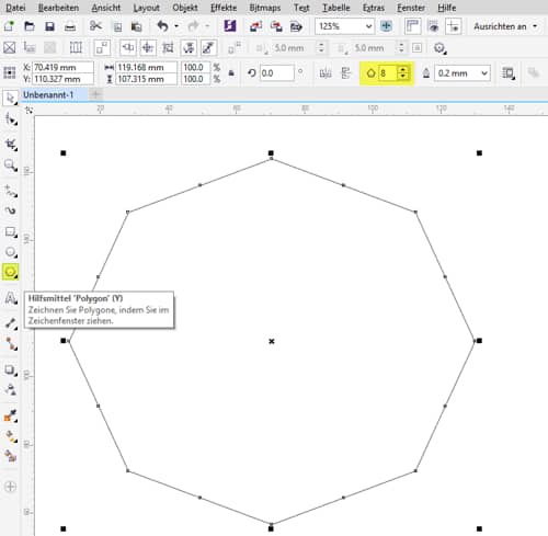 Wenn Sie das Polygon gezeichnet haben, wählen Sie es mit dem Hilfsmittel Auswahl aus. Sie können die Zahl der Seiten jederzeit ändern, indem Sie in der Eigenschaftsleiste im Feld Punkte oder Seiten einen Wert eingeben. Denken Sie daran, dass Sie das Objekt mit dem Hilfsmittel Auswahl selektieren müssen, wenn Sie es ändern möchten.