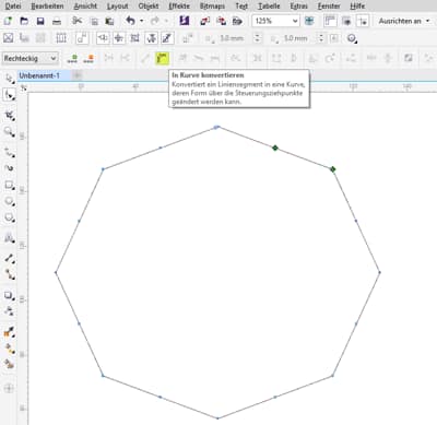 Zwei der Knoten werden nun markiert und in der Eigenschaftsleiste werden Optionen zur Bearbeitung der Knoten angezeigt. Klicken Sie auf das Symbol In Kurven konvertieren.