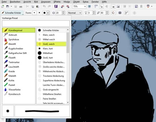 Beim Zeichnen der Personen schalte ich die Sichtbarkeit der Objekte des englischen Parks vorübergehend aus (deaktivieren Sie dazu das Augensymbol für diese Ebene im Andockfenster Objekt-Manager). Um die Umrisse zu zeichnen, verwende ich das Hilfsmittel Malfarbe mit einer runden Spitze und wähle in der Pinselkategorieauswahl in der Eigenschaftsleiste den Künstlerpinsel Schneller Kritzler. Dieser Pinsel erinnert an einen Filzstift. Dann schalte ich die Sichtbarkeit des englischen Parks wieder ein und erstelle ein neues Objekt, um den Nebel und rauchartigen Hintergrund hinter den Personen zu malen.