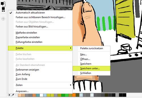 Wenn Sie gleichzeitig mehrere Illustrationen für denselben Artikel erstellen, möchten Sie wahrscheinlich die gleichen Farben verwenden. Verwenden Sie dazu die Bildpalette in Corel PHOTO-PAINT (in CorelDRAW heißt sie Dokumentpalette). Diese Paletten schätze ich wirklich sehr. Farben können auf verschiedene Weisen ausgewählt werden, aber ich wähle immer schnell einige wenige Grundfarben aus und male sie auf ein Objekt. Dann ziehe ich diese Farben auf die Bildpalette, die standardmäßig unten auf dem Bildschirm angezeigt wird. Danach öffne ich mithilfe des schwarzen Dreiecks auf der Bildpalette das Flyout-Menü und wähle: Palette > Speichern unter. Ich gebe meiner Palette einen eindeutigen Namen. In diesem Fall nenne ich sie zum Beispiel „Redaktionelle Illustration“.