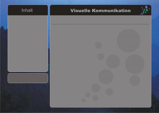 Das linke Rechteck wird als Navigationsfeld benutzt, das rechte für die eigentlichen Informationen. Unter Umständen empfiehlt es sich, eine dunklere graue Linie zu ziehen, die die Überschrift vom Text trennt.