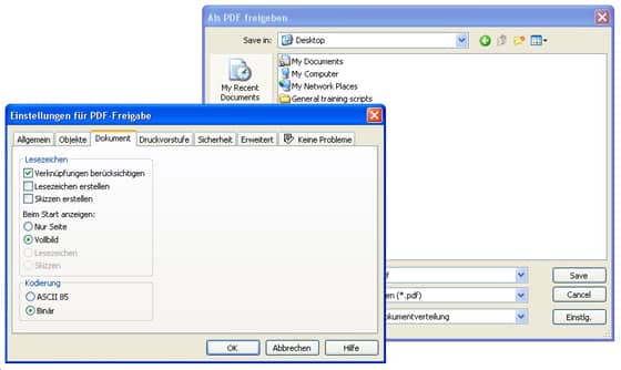 Das Dialogfeld Als PDF freigeben wird angezeigt. Klicken Sie in der rechten unteren Ecke dieses Feldes auf die Schaltfläche Einstellungen. Damit wird ein weiteres, umfassenderes Dialogfeld geöffnet: