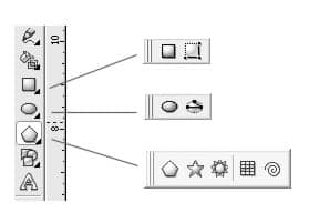 With CorelDRAW®, drawing basic shapes — such as rectangles, ellipses, polygons, and stars — is quick and easy. All the tools you need are easily accessible from the following flyouts in the toolbox: the Rectangle flyout, the Ellipse flyout, and the Object flyout.