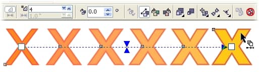 Let's examine these effects more closely to see the advanced object-engineering involved. In the illustration below, a four-step blend effect is applied to two characters, which creates a series of four intermediary character weights. The control object on the left includes a 100 percent PANTONE® 152 orange fill and a 100 percent PANTONE 485 red outline. The control object on the right includes a 100 percent PANTONE 606 fill and a 100 percent PANTONE 471 brown outline. The blend objects form a four-step progression between the two shapes.