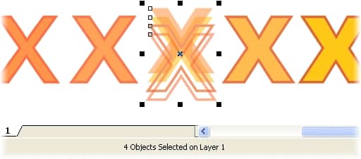 Each blend step that CorelDRAW produces in the effect is a unique combination of objects. Dismantled, each step can include four separate objects: two objects that represent each of the spot color fills and two objects that represent each of the spot color outlines (see below).