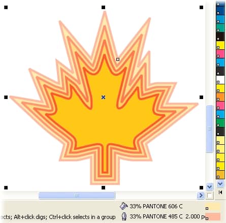 In the example below, the Interactive Contour tool was used to apply spot color inks and a contour effect to a simple shape. The object is set to a 100 percent PANTONE 606 yellow fill color and a 100 percent PANTONE 485 red outline color. The same colors are used for the default contour effect, which is a three-step outside contour with a 0.05-inch offset.