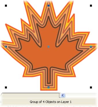 When dismantled, the end contour is a single object that includes percentage tints of the original control object's spot colors. The intermediary steps in the contour are also single objects with color tints applied, as shown below. The precise tint values are based on the number of contour steps, the control object ink colors used, and any color acceleration properties applied.