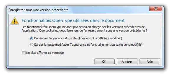 De là, vous pouvez enregistrer ce document dans une version antérieure dans un format modifiable ou non modifiable (voir Figure 11). Si vous choisissez l'option Garder le texte modifiable, CorelDRAW remplacera les fonctionnalités OpenType par d'autres de sorte que le texte reste toujours modifiable en tant que texte. Si vous optez pour Conserver l'apparence du texte, c'est-à-dire la version non modifiable, CorelDRAW convertira en courbes le texte OpenType incompatible. Dès lors, il ne sera plus possible de modifier le texte comme texte, mais comme vecteurs.