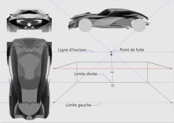 Dessiner une voiture de sport en perspective centrale avec l'outil perspective, distorsion de perspective et repères