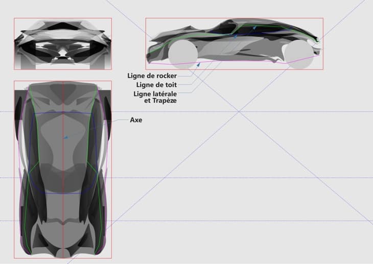 Dans la conception automobile, il y a certains termes qui reviennent souvent parce qu'ils désignent les caractéristiques que toutes les voitures ont en commun, indépendamment du type et de la forme. Dans notre design, nous indiquerons trois grandes lignes, que la vue en plan et la vue de profil ont en commun, pour nous aider à projeter des points en perspective.