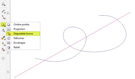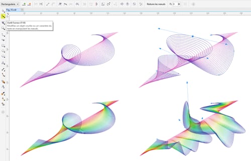 Souvenez-vous que vous pouvez également utiliser l'outil Forme pour modifier la courbure des objets de départ et d'arrivée en ajoutant ou en supprimant des nœuds (pour redresser les trajectoires incurvées, etc). Les modifications appliquées aux objets de départ et d'arrivée se répercutent sur l'ensemble du dégradé, ce qui décuple le potentiel de création.