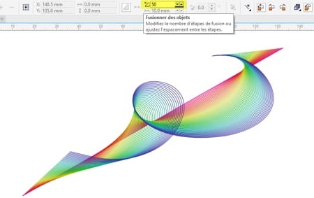 Entraînez-vous sur quelque chose de simple. Sélectionnez le dégradé de groupe et, dans la barre de propriétés supérieure, augmentez le nombre d'objets/étapes du dégradé, comme illustré sur l'image suivante (le nombre des étapes de dégradé passe de 20 à 50).