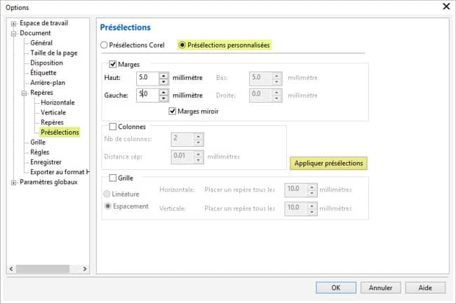 Sans quitter le panneau Options, sélectionnez Documents > Repères > Présélections > et choisissez Défini par l'utilisateur pour créer une marge intérieure de 5 mm. N'oubliez pas de cliquer sur le bouton Appliquer présélections. Après avoir cliqué sur OK, notre page est prête et nous pouvons commencer à travailler.