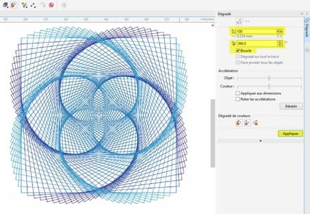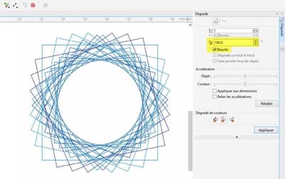 - Sélectionnez de nouveau le dégradé de groupe, puis affichez le menu fixe Dégradé. Réglez la fusion des objets sur 100 étapes (20, par défaut) et le sens du dégradé sur 360, puis cliquez sur Appliquer.