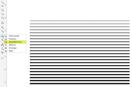 - Sélectionnez l'outil Dégradé interactif dans le menu contextuel des outils Effets. Faites ensuite glisser l'outil d'une ligne à l'autre (l'ordre de passage n'a pas d'importance à ce stade). Vous devriez obtenir un dégradé de lignes.