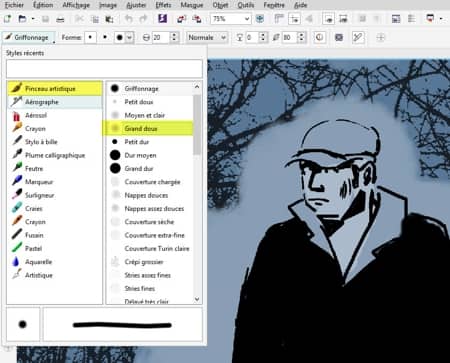 Pour dessiner les personnes, j'ai temporairement désactivé la visibilité de l'objet Parc anglais (en désactivant l'icône Œil pour ce calque dans le menu fixe Gestionnaire d'objets). J'ai utilisé une pointe arrondie de l'outil Peinture, en choisissant Griffonnage > Pinceau Art, dans le sélecteur de pinceau de la barre de propriétés pour dessiner mes contours. Ce pinceau rappelle la pointe d'un vrai feutre. J'ai ensuite réactivé la visibilité du parc anglais et créé un nouvel objet, en dessinant le brouillard et l'arrière-plan semblable à de la fumée derrière les personnes.
