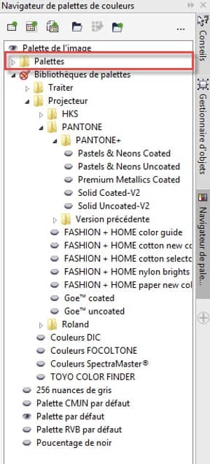 Quand je commence la seconde illustration, je clique simplement sur le bouton Personnalisation rapide à côté du menu fixe Gestionnaire d'objets, et cette fois, j'ouvre le Navigateur de palette de couleurs > Palettes. La palette « Illustration - Éditorial » apparaît bien. C'est juste simple et brillant.