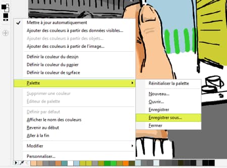 Lorsqu'il faut travailler sur plusieurs illustrations pour le même article, certains aiment utiliser les mêmes couleurs. Pour cela, vous pouvez utiliser la palette Image dans Corel PHOTO-PAINT (la Palette du document dans CorelDRAW). J'aime vraiment ces palettes. La méthode et les couleurs choisies peuvent être différentes, mais je sélectionne rapidement quelques couleurs de base et je peins avec sur un même objet, puis je les fais glisser et les dépose sur la palette Image, qui, par défaut, est ouverte au bas de l'écran. Ensuite, à l'aide du triangle noir qui se trouve sur la palette Image, j'ouvre le menu flottant et je sélectionne : Palette > Enregistrer sous. Je donne un nom unique à cette palette personnalisée. Je la nomme « Illustration - Éditorial ».