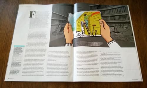 Je réalise fréquemment des illustrations à caractère éditorial pour différents magazines (en ligne et papier) et c'est une activité que j'apprécie tout particulièrement. J'aime la diversité des thèmes car cela nourrit ma créativité. Parfois, il s'agit de dessins informatifs, comme un dessin sous deux pages expliquant la découverte du câblage électrique KNX en écoutant de la musique au travail, la fois d'après je peux être amené à travailler sur la surveillance de personnes. Comme vous le voyez, les thèmes peuvent être très différents.