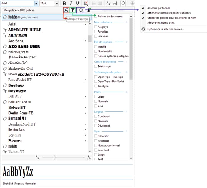 Sur un système, il est possible d'avoir quelques polices installées et des milliers d'autres non installées. Les catégories de filtres de polices disponibles sont les suivants : État de la police, Centre de contenu, Poids, Largeur, OpenType etc. Plus de 50 filtres catégorisés sont disponibles pour gérer les polices à afficher et utiliser.