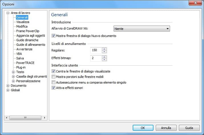 Si può anche disattivare la finestra di dialogo Crea un nuovo documento selezionando il menu Strumenti > Opzioni e scegliendo Area di lavoro > Generale e disattivando la casella Mostra finestra di dialogo Nuovo documento. Per riattivare l'opzione, basta spuntare la casella Mostra finestra di dialogo Nuovo documento nella finestra di dialogo Opzioni (figura C).