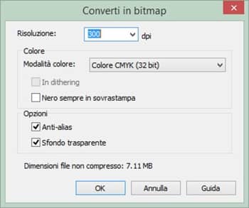 Convertire in bitmap (Bitmap > Converti in bitmap...), selezionando la casella Sfondo trasparente e scegliendo come Modalità colore RGB o CMYK in base al proprio flusso di lavoro.