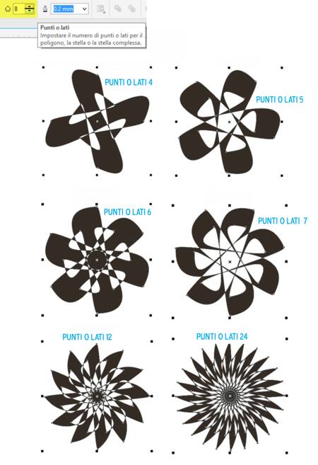 Proviamo! Selezionare il poligono e modificare il numero di lati digitando un valore nella casella Punti o lati nella barra delle proprietà. Il poligono sarà trasformato automaticamente in nuove forme come in questo esempio.