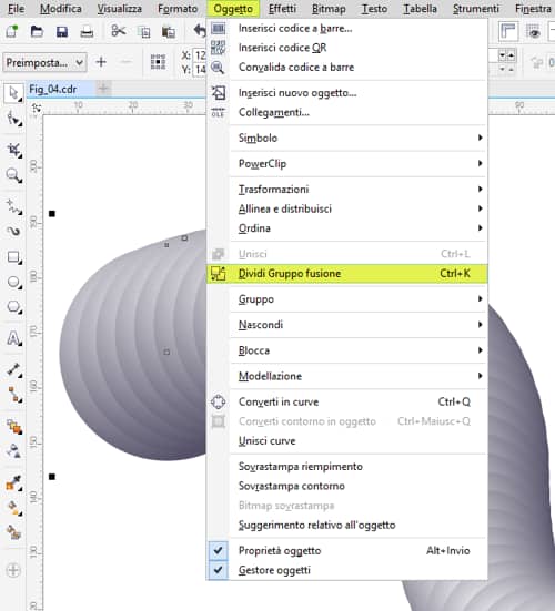 Una volta ottenuta la fusione desiderata non è più necessario modificare le proprietà ed è possibile eliminare il tracciato. Per farlo, selezionare il menu Oggetto > Dividi fusione. Quindi, fare clic sul tracciato e rimuoverlo con il tasto Canc.
