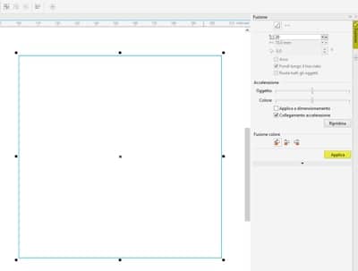 Anche in questo caso non si nota alcun cambiamento. Va bene, dato che entrambi gli oggetti erano delle stesse dimensioni e sono allineati, ma ora, selezioniamo solo uno dei quadrati e lo ruotiamo di 180° (nella barra delle proprietà). Anche se si suppone che ruotando di 180° un quadrato non cambi, in realtà cambia la direzione della fusione, dato che viene modificata la posizione dei nodi.