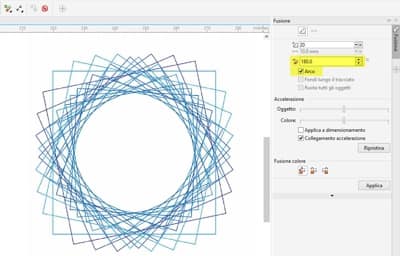 Ora selezioniamo il gruppo Fusione. Nella finestra mobile Fusione, impostiamo Direzione fusione su 180° e attiviamo "arco", quindi facciamo clic sul pulsante Applica.