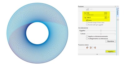 - Selezioniamo di nuovo il gruppo Fusione e andiamo alla finestra mobile Fusione. Modifichiamo la fusione degli oggetti su 100 passaggi (il valore predefinito è 20) e la direzione di fusione su 360, quindi premiamo Applica.
